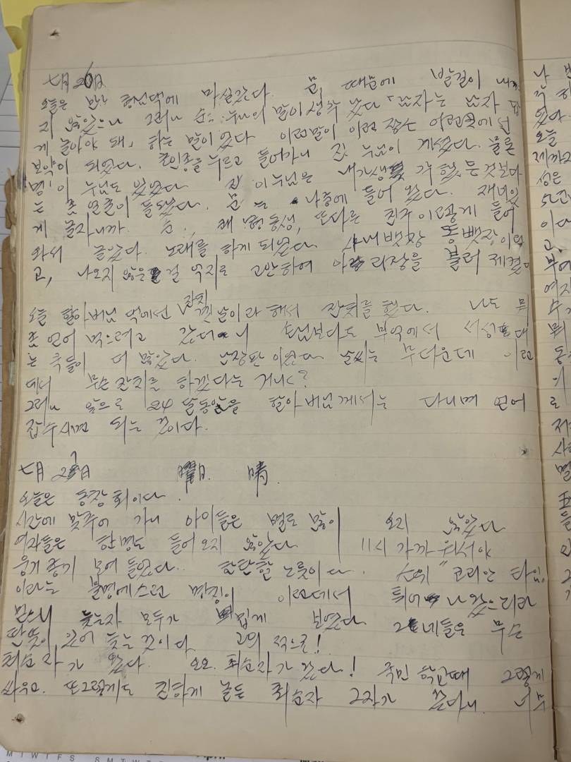 또 며칠 만에 펜을 든다. 며칠간 형님이 들어오지 않더니 오늘에야 들어왔다. 김선생님 댁에서 밤을 지냈다고 했다. 형 없이 자는 날은 네활개 뻗고 자서 기분은 놓으나 어느 한구석이 허전함을 면치 못하겠다. 형님한테 방학 때 캠핑 갈 것을 허락받았다. 물론 거기에 필요한 돈도 준다고 했다. 한결 가뜬해진다.